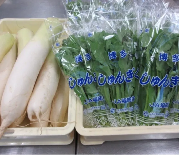 12月のメニュー「春菊と大根のサラダ」は幼稚園のすぐそばで生産されている【博多春菊】と、でこぽん広場の畑で年中の子ども達が育てた【幼稚園産の大根】を使いました。